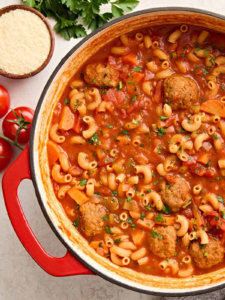 This Hearty Meatball Soup is made with Italian-style turkey meatballs, a rich tomato-based broth, veggies, and pasta....