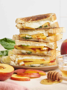 Juicy peaches, fresh basil, and melty mozzarella make this Honey Peach Grilled Cheese a simple, budget-friendly sandwich...